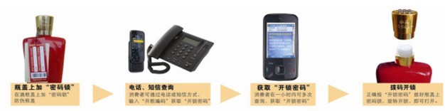 对 高档白酒类产品,采用“密码锁防伪瓶盖”进行防伪,在不影响其现有生产工艺流程前提下,只需在其产品入库前将带有防伪吊牌的“密码锁防伪瓶盖”扣装在其原 有瓶盖上即可。此时,“密码锁防伪瓶盖”即与原有瓶盖锁定为一体、无法开启;只有通过防伪吊牌上提供的查询方法获取“开锁密码”后,才能开启。消费者在购买带有“密码锁防伪瓶盖”的高档白酒产品后,通过防伪吊牌上提供的查询方法,拨打固定电话或发送短信,系统将告知被查询产品真伪、“开锁密码”。